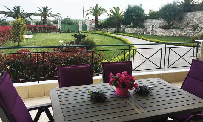 Being 75 sq meters and 3,2 km from the sea, the house is located on a hill overlooking the Messinian Bay. The condo itself is part of a bigger building with 3 neighboring condos and 2 small guest rooms each having their own private balconies and common but private garden and parking. The small estate is at the end of the village and in between olive tree orchards. The house has a new country style decoration with plenty of commodities including AC in all rooms, TV, DVD, free WiFi and a fully equipped gas stove kitchen. A common laundry is provided for all residents.