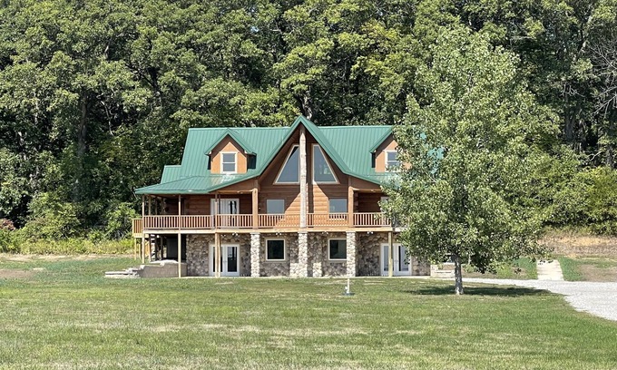 Beautiful lodge surrounded by nearly 40 acres of timber with hiking trails and a pond. Enjoy the amazing sunsets on our wrap around porch. Sit out by the fire under the stars roasting marshmallows The kids are sure to enjoy the fresh air.