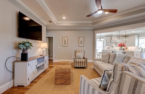 This newly built 4 bedroom, 2 bathroom home is located in a quiet residential neighborhood just 3 miles from the best shopping & dining in downtown Thomasville. The home has a spacious kitchen featuring stainless steel appliances and all the essentials for entertaining. The all season patio is just off the kitchen and living room making it an ideal location for water views and relaxation. The living room has ample seating on a large sofa, and a large flat screen smart tv with WiFi.