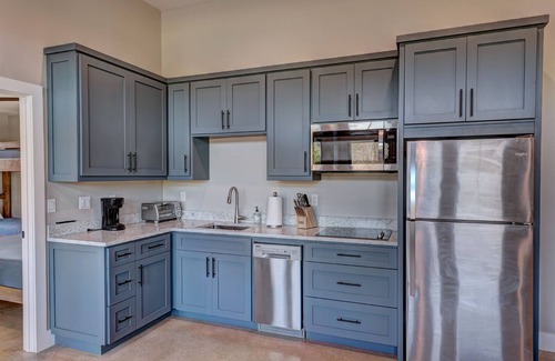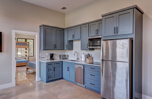 Rio Cuesta is a brand-new riverfront home situated on 5 acres across the river from the historic Vista Camps. The home consists of 2 bedrooms each having one king sized bed and two twin xl bunk beds. Each bedroom has a full bathroom with a standing tile shower. The full kitchen and open living area has stunning views of the Cypress trees and Hill Country hills. Take a short stroll to the covered pavilion that overlooks the Guadalupe River. Kayak, fish, explore or swim on the expansive riverfront! There is an amazing riverfront patio to enjoy all river activities!