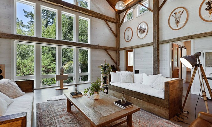 The property centers on a restored 1890's timber frame barn and a stylish mid-century guest house and offers nearly every modern amenity including: