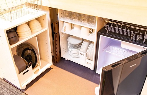2F Bedroom twotiered tower upper bed space lower tatami space Toilet room / There are many room facilities such as a kitchen and a washing machine for longterm guests including families and business persons Although the room feels out of the ordinary you can spend time here and use the room practically