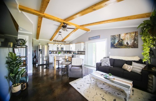 There is a full size sofa bed in the living room to accommodate two extra guests. The bedroom is a queen size bed with memory foam mattress and nightstands with cordless charging station for your cell phone. A ceiling fan keeps the room nice and cool in the summer but extra warm in the winters. The bathroom has a deep set jetted bathtub with a personally designed beautifully tiled shower surround. The vanity has plenty of storage space for your toiletries. There is complimentary face wipes, cotton swabs and cotton balls and a hair dryer. There is a washer and dryer for your use in the utility room. There is wifi throughout the home with a roku tv where you can log into your favorite streaming app to enjoy a movie night or catch up on your favorite tv series.