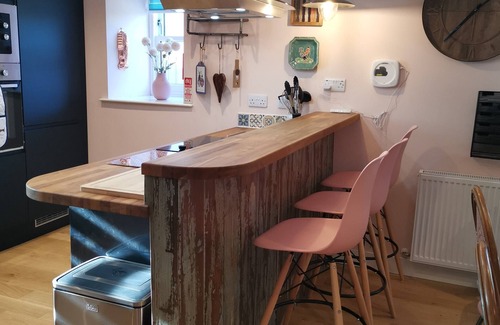 kitchen - with breakfast bar and stools, electric ceramic hob, electric single oven, integrated microwave, integrated fridge and freezer, integrated dishwasher, washing machine, tumble dryer