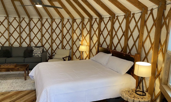 Tucked away on 73 acres of private land, enjoy being surrounded by nature while also having access to modern necessities in this newly built yurt. Perfect for a couple’s retreat, this open concept layout offers a comfortable king size bed, small sitting area with sleeper sofa, and a kitchenette/dining space that will meet all of your needs during your stay. Additionally, there is a full bathroom in-unit so there is no need to brave the wild in the middle of the night.