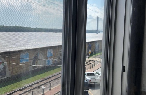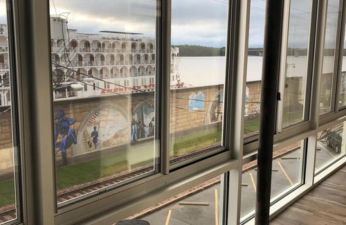 The building was constructed in 1880. The upstairs was converted into an industrial style apartment which hosts a large glassed in balcony overlooking the Mississippi River. The master suit includes a large bathroom with walk in shower and locally made round bathtub. It is located in downtown Cape Girardeau where there are numerous antique stores, restaurants, and historical sites within walking distance.