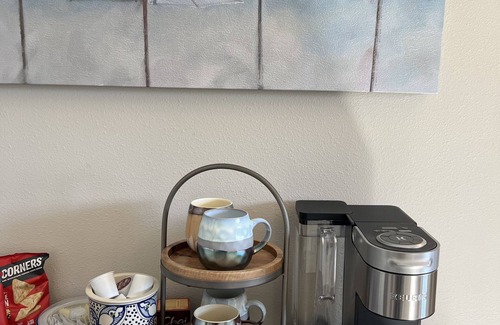Unit B is a 1 bedroom featuring a queen bed, closed off with a barn door, with a full en-suite bathroom with tub/shower combo. It has a separate open living space with a sofa bed and large chef's kitchen complete with everything you'll need to cook delicious meals. This unit has a laundry room.