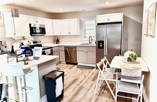 Make your way into our beautifully renovated kitchen where you will find complimentary wine left for all of our guests! Coffee maker, pots and pans, cutlery, plates, cups, and more are available for all your cooking needs. There is a small, charming dining area off the kitchen and counter-height dining in the kitchen for additional seating.