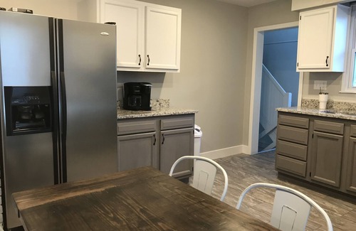 Newley remodeled 5 bedroom 4 bath home. Main level includes fully stocked kitchen, living room with sectional and smart T.V. Also main level has two bedrooms with a queen bed in each and one shared bathroom. Upper level has two more bedrooms with a queen bed in each and a shared bathroom and a cute little vanity area outside the bathroom. The basement includes one open bedroom with 2 queen beds and two bathrooms and a small living area with smart TV. All bedrooms have a smart T.V. also.