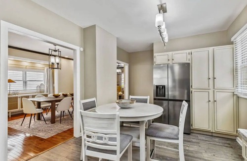 The house has a spacious kitchen with plenty of countertop area, a convenient half bathroom, a formal dining room, and two living areas (one of them has smart TV but you can watch the TV from both areas) on the first floor. Ample free parking is available in the driveway and on the street. Guests are welcome to use both the front and back porches, though furniture for these areas is not provided. Upstairs, the second floor has three bedrooms, including two with queen-sized beds and one with one king-sized bed and queen sized bed, along with a full bathroom. The spacious third floor features two twin beds and a king-sized bed. Laundry machines are located in the basement.