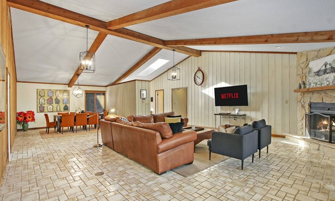 Our spacious open-concept living area is the heart of the cabin, with wood beams cathedral ceiling, boasting comfortable seating, a warm fireplace, and large windows that invite the outdoors in. Relax in style and enjoy quality time with your loved ones.