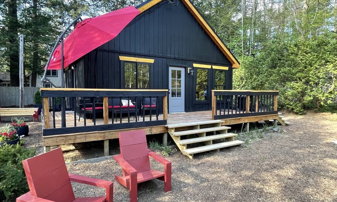 Stay with us at the newly remodeled (2022) Black Pines Cabin located just 1/10th of a mile to the local beach and 0.6mi to the waterfalls. Listen to the loons on the deck or enjoy a lovely fire out back. We offer a full kitchen, Queen Bedroom, and up the narrow ladder is our Loft Bedroom with a seasonal glimpse of the lake.