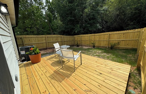 Fenced-in backyard with small patio set. There is a smart lock on the front door that allows you to check-in at your convince.