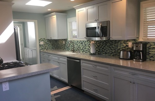 Located only 10 houses from the sand, this recently remodeled, single-story beach bungalow has all the amenities for your relaxing vacation. Surrounded by a private garden and privacy fence on a quiet family-oriented beach lane, this classic beach house has a gourmet kitchen, stainless steel appliances, dishwasher, disposal, coffeemaker, small appliances and filtered drinking water.