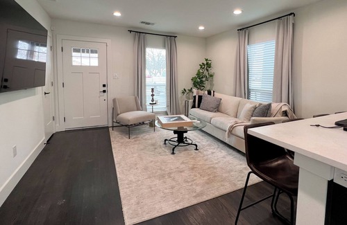 Take it easy at this unique and central getaway. This fully renovated 1920's bungalow has charm with all the modern amenities. Unwind in the glow of the patio fire pit. Create a masterpiece in the kitchen with modern induction stove, top of the line cookware, and stocked spice drawer. Cuddle up to your favorite movies with bedroom TV or the massive living room TV. Relax in the waterfall shower or soaking tub. Play in downtown Ft Worth(10min), or the Stockyards/Cowboys Stadium/Six Flags/Texas Ranger's Ballpark (20 mins). Food bowls and large fenced backyard perfect for hosting you dogs as well.