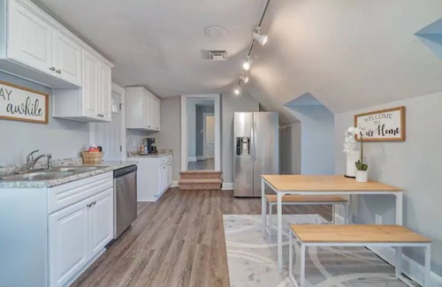This newly remodeled 3 bedroom, upstairs apartment is perfect for a family, group of friends, or people traveling for work. Large bedrooms with comfortable beds, each room with it's own smart tv for streaming all your tv shows with. Fully equipped kitchen and coffee station with filtered water and ice maker. Living room features 60" TV. Excellent central location, but very private as this is on a large lot with only one neighbor. Very safe and easy to find.