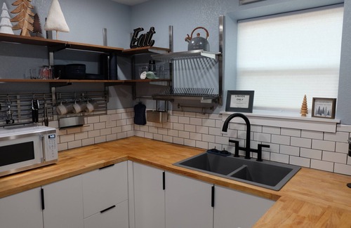 pack lunches for the lake or hiking trails. The kitchen is furnished with dishes, cookware, utensils, and all