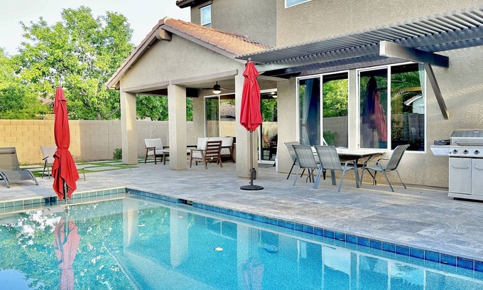 Beautiful & spacious vacation home located in one of the best areas in AZ. Only minutes away from the 202, loop 101 and 60 freeway. This family friendly neighborhood has several shaded parks, hiking trails, shopping centers, restaurants & more within walking distance from the house. The Large backyard has a sparkling pool, luxurious spa, propane grill, outdoor lounge furniture, patio seating, additional dining table, pool floats/toys, and yard games. Both adult size & kid floats available. Enjoy the amazing weather, beautiful area & peace of living in a quiet environment. Perfect for those who are looking for a getaway experience.