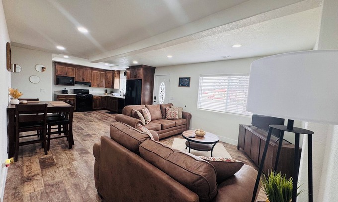 The living/dining room includes a dinner table for four, a sofa, loveseat and Roku Tv so you can sign into your own streaming apps. We also provide a few board games and a deck of cards as well.