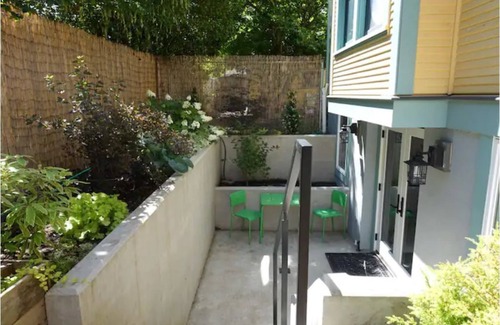The basement apartment is accessible through a private entrance on the south side of our home. It includes a private garden patio that is not utilized by the homeowners when guests are staying with us. There is a locked door separating the apartment from our laundry room - we only run this washer and dryer during daytime hours when guests are staying with us.