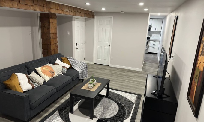 Experience peace and comfort in this spacious suite that has been recently renovated to make you feel at home. The suite features a dedicated workspace where you can focus on your job or studies. Alternatively, you can unwind and relax by the fireplace. This private 2-bedroom suite is located in a quiet neighborhood, in close proximity to restaurants, shopping centers, supermarkets, gyms, drugstores, and other essential amenities. Additionally, it is just a 10-minute drive away from the airport.