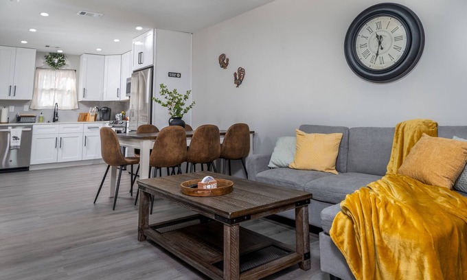 Discover rustic feel at our newly renovated Oakwood Farmhouse Townhome. Two spacious bedrooms boast king-sized beds for serene nights, and a sleeper sofa accommodates two more. Ideal for six guests, our home offers an open-concept living space, a fully equipped kitchen great for home cooked meals.