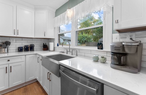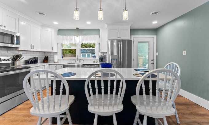 Kitchen & Dining: The fully equipped kitchen boasts modern appliances and ample counter space, making meal preparation a breeze. Enjoy your culinary creations in the eat-in kitchen, or on the back deck, with seating for 4-6 people. The kitchen is fully stocked with utensils, plates, bowls, pots, pans, baking sheets and more!
