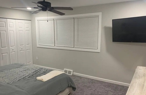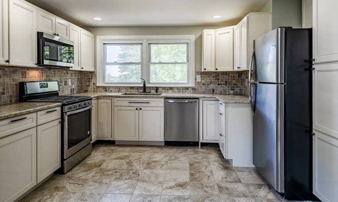 Enjoy this 4 bedroom newly renovated home. Hosing 8 guest very comfortably with 2 king size beds and 2 queen size beds all in separate rooms. This home has 2 bathrooms one on the Top floor and one on the bottom. The Exteior of the home is also wonderful, it has a garage l,driveway, and large yard.