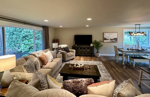 Newly renovated in 2023, this lovely secluded, 2 story home will easily accommodate up to 4 - 8 people. Artfully decorated and beautifully appointed, with brand new furnishings, beds, linens, appliances and housewares. All beds have comfortable pillow top mattresses, down quilts and plenty of extra blankets and pillows. The remodeled kitchen boasts brand-new stainless-steel appliances, numerous small appliances, luxury cabinetry, and the kitchen is fully stocked to create everything you could ever need to cook a delicious meal! The spacious granite counters and island offer plenty of space for meal preparation. A light supply of coffee & tea will be available upon your arrival. Snuggle up in front of the gas fireplace in the den during the fall and winter months and enjoy air conditioning during the summer (a rare treat in the Pacific Northwest). Smart TVs are provided in all the 4 bedrooms and both the front living room and back den have large flat screen TVs. Both the luxurious master and main bathroom have elegant, large tiled walk-in showers and a supply of towels and toiletries are provided for your convenience.