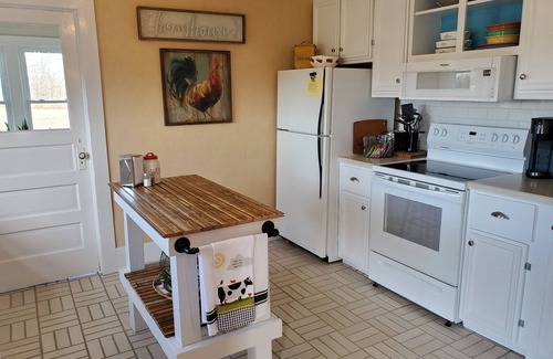 This centrally located/newly renovated farmhouse has been in the Bernard family for 100 years. It is15.8 miles from Jamestown Marina (Safe Harbor), 13 miles from Lake Cumberland (Alligator II) Marina, 18 miles from Lake Cumberland State Park and Marina, and 17 miles from Wolf Creek Dam. It is right off of the Cumberland Parkway, and a short distance to both Columbia and Somerset. This 4th generation farmhouse is the perfect place to relax with family and friends after a day of boating on the lake or fishing on the river. It is cozy, inviting, clean, and welcoming. And it is pet (dogs only) friendly! The large front porch has 2 rockers, a swing, and a chase lounger. Inside are 3 bedrooms, a family room with a comfy leather couch, which leads to a living room with more comfortable furniture. The dining room has a large dining table seating 6. Off the dining room is the kitchen stocked with everything you need for preparing and dining (except for the food, of course!). The original bathroom boasts a 1950’s tub with newly added showerhead, and the original beadboard ceiling. Our "new" 2nd bathroom has an amazing soaking tub that is always a hit with renters. The main floor bedroom has a tempur-pedic adjustable queen bed. The 2 bedrooms upstairs are full of charm and warmth, each with a queen bed. The floors are all original throughout the house. Each and every room in the house has a perfect combination of new furniture and antique pieces. A french door in the dining room opens up to a deck with a griddle grill and 2 tables. To the right of the deck is a large firepit and 6 chairs. We provide wood for our guests to use. There is a large backyard for kids to run around and play. Also, in the summer you will be surrounded by crop (corn or soy), because it still is a working farm.