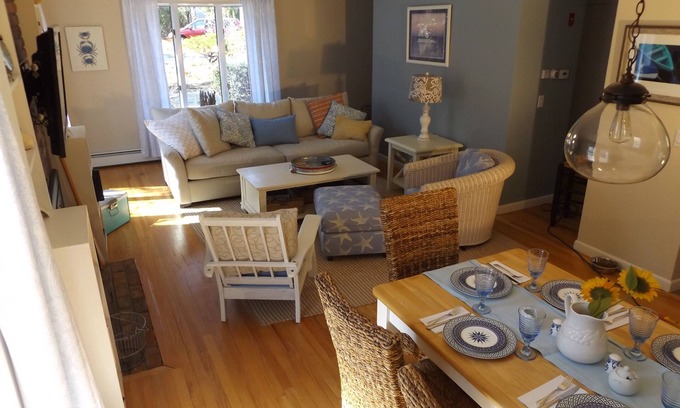 This home has been newly purchased and updated. New furniture, newly decorated, new mattresses and linens. Washer and dryer on first floor along with master bedroom with queen bed and bath on first for easy access. The kitchen has everything you will need for your stay, a lobster pot, and even an ice cream maker for rainy days. Open airy living space with plenty of room for family and friends. Outdoor patio with grill for BBQ. A working gas fireplace for cozy nights when the weather gets cooler and central air conditioning for those humid days. With themed bedrooms this home sleeps eight comfortably. The "Paris" room has a queen bed, large closet and dresser. The "Whale" room has a double bed and twin trundle along with a walk-in closet and dresser. Great for teenagers or young children. A large bathroom and stocked linen closet in the hall. We also have WiFi just in case you can't leave all your work behind.
