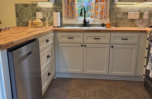 The full kitchen with dishwasher and butcher block breakfast bar is open to the living space for optimal socializing. We've tried to think of every kitchen gadget you'll need to cook up a meal, bake some cookies, blend a frozen drink, or just microwave some popcorn. There's also a full-size washer and dryer with steam feature to keep you fresh and sharp.