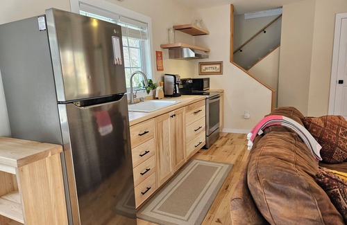 Beautifully renovated cottage featuring an open common space on the main level with a full kitchen, dining and living area, wood burning stove, and bathroom with shower stall. Second floor is the bedroom space with a double bed and two single beds. Clean and adorable.