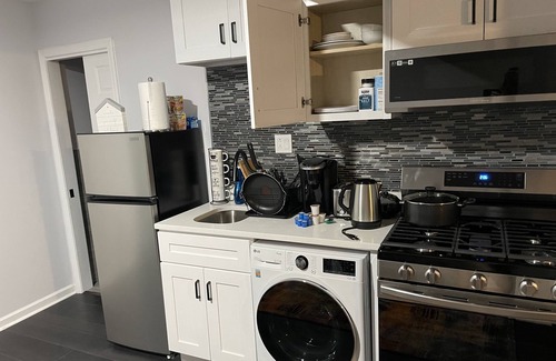 650 sqf with kitchen , washer/dryer , modern bathroom, tv , recliner, grill , patio table and chairs. Very quite safe and modern area. 2 mins to i400 highway. 8 mins to North Pointe Mall and 10 mins to Avalon.