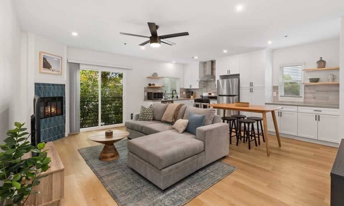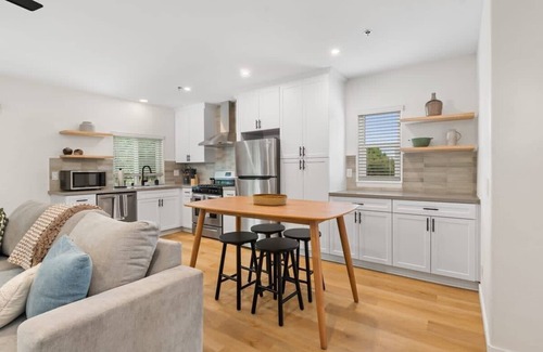 Enter into an open floor plan, spacious living room and kitchen that has been fully renovated with professional design from the acclaimed Solstice Interiors. There is a full bathroom and tub in the hallway common area and a washer and dryer for your exclusive use during your stay. Master bedroom has an en suite full bathroom. This is a second story apartment located above quiet office space on a residential street right by the beach.