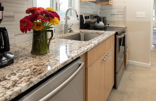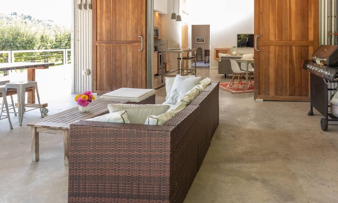 The large airy King Bedroom has a contemporary four poster bed. A carpeted bunk bed bedroom sleeps two. The main living area, the former fermentation room for the cidery, is a modern urban-inspired open space with new full service kitchen, seating area with TV (for playing movies from your laptop) and dining area that seats four. Starlink WiFi is available.