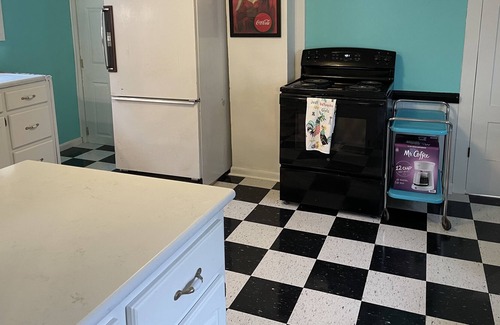 The kitchen-dining room is a time machine to an era of black and white tiled floor, glass-tiled wall, double cast-iron porcelain sink, custom cabinetry, mid-century table and chairs, and a view of the Otsquago Creek. Granite counters, stove, dishwasher, microwave and a full complement of utensils provide everything for our culinary guests.