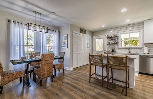 This centrally located home is the perfect spot for your trip to Beaufort, SC. Located in the Mossy Oaks neighborhood it is in close proximity to the Spanish Moss Trail and Downtown Beaufort. This home has recently been fully remodeled and has brand new upgraded appliances. With an open floor plan, the home feels spacious and inviting. A fully equipped kitchen provides you with all the essentials for cooking meals at home. A half bath is located downstairs while the two master bedrooms are both located upstairs and have ensuite bathrooms and smart TV's. Outdoor accommodations include a covered front porch with seating and a fenced in backyard.
