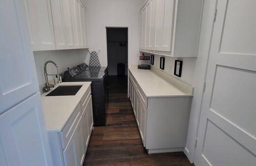 The full sized kitchen has a side by side fridge, double oven, a range, dishes, flatware, coffee maker (pods and/or a carafe), toaster, blender, etc. The laundry room has an oversized top-load washer and dryer. We have a charcoal Weber grill on the patio. The oversized garage can easily house two pick-up trucks. The private driveway is also long enough for 8 more vehicles. The home is in a very established neighborhood in Fort Worth with security cameras covering every inch of the exterior of the property. Your safety and security is our highest priority. We also have plenty of towels and sheets on site. The home is practically new and has it all!