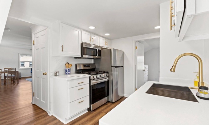 Make yourself at home in the comfy newly renovated 1 bedroom upper unit in a family friendly neighborhood. The property comfortably accommodates 2 people for this 625 sf unit. The unit has an interior shared stairway, or a private entrance from an outdoor stairway and rooftop patio. The home is furnished with a new queen size mattress with living/dining room and in unit laundry room. Off street parking and garage space is available. Includes WIFI! We are looking forward to hosting you!