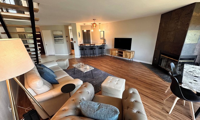 Complete with gas fireplace, fully stocked kitchen with new appliances, beautiful spa-like