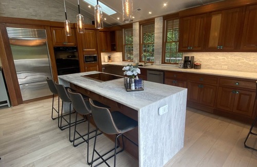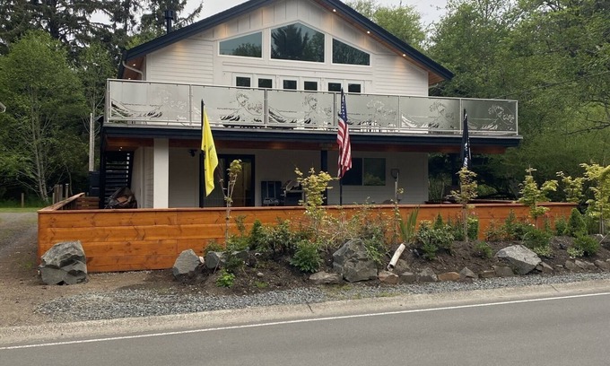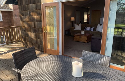 The Seawind just went through a complete Renovation, updating the entire house inside and out! Our home is located within walking distance of downtown Cannon Beach where you can enjoy the great restaurants, coffee shops, and retail stores. We are on Fifth St., right across the street from Les Shirley Park and the Pacific Ocean, where you can walk directly through the park to access the beach. Enjoy beautiful views of the park and the sounds of the ocean from the upper deck. The home features four bedrooms and two full baths. Three Bedrooms include a king-size bed, and the fourth bedroom has two king beds with two additional twin beds, a great family-friendly home. The two bedrooms upstairs both feature a Juliet balcony to enjoy the fresh ocean air, lots of storage, and 65 inch smart TVs. The kitchen has been fully updated with high-end appliances; Double Oven, Ice Maker, and it comes fully equipped with a large entertaining bar. The greatroom features a cozy gas fireplace, two 76 inch TVs, Wifi, Cable, and surround sound, with plenty of room for the entire family. From the main level, open the three french doors and enjoy the large private wrap-around deck with seating and a gas fireplace. The lower level includes two bedrooms, a full bath, and a laundry room. You can access the fully fenced yard and dry-covered deck with a new 8 person hot tub and firepit from the fourth bedroom. Enjoy this home's private setting, which includes a beautiful creek that runs directly through the property, lots of space for parking, a Tesla Charger, and RV Hook-ups with 50 and 30 amp plugs. Unfortunately, we do not accommodate pets.