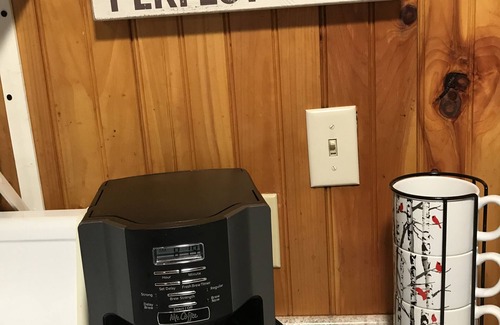Once you step inside the cabin you'll see and feel "Country". There's pine ceilings and a custom made island for sitting around and discussing the days events or for just sipping coffee first thing in the morning. The island is adorned with drift wood and wooden limbs from our property behind the cabin, which gives the cabin a very rustic, and comfortable feeling of relaxation. This replaces a traditional kitchen table and chairs in the cabin.