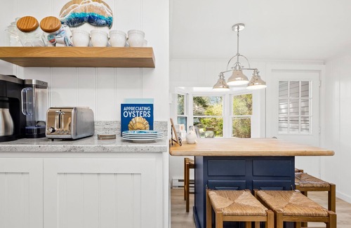One of the most amazing attributes of Cape Cod living is the availability of farm and boat to table ingredients. The gourmet kitchen was designed with that in mind. Whether guests choose to cook for themselves or hire a local chef, this well appointed space will inspire. The six person island is a perfect spot to dine or sit and watch the action. The island can easily be slid over to provide ample space for prep and seating on both ends. The five burner gas stove and commercial grade exhaust fan are powerful enough for home cooks to produce restaurant quality meals. The ultra quiet Bosch dishwasher makes cleaning up after a breeze. The generous refrigerator/freezer keeps foods fresh and a pantry and lazy susan provide plenty of storage for guest groceries. The built in beverage bar will be the morning hub. A Keurig Duo coffee maker has settings for single cups or full pots. Take the thermal carafe down to the beach and enjoy breakfast by the water! In addition, to the appliances mentioned above there is a wide slot toaster, microwave, crock pot, electric mixer, mandoline, quality knives and sharpener, blender, a large assortment of serving ware, high quality pans and bakeware, cutlery and kitchen gadgets ranging from an oyster shucking knife to a fish scaler. Guests will have everything necessary to prepare and serve their own creations or to fool friends with take out from a local restaurant.