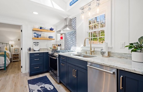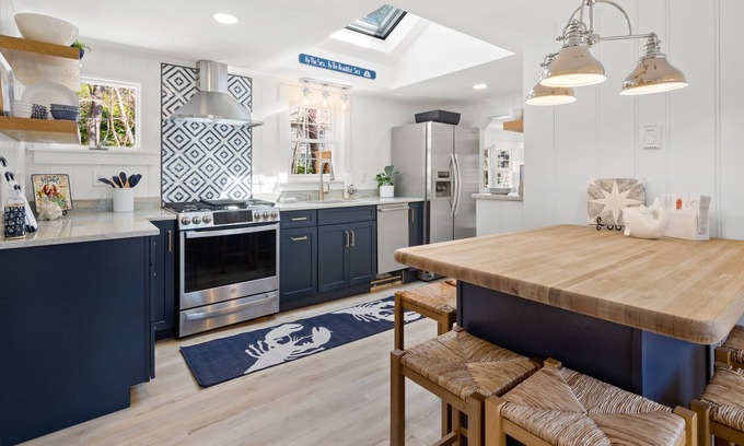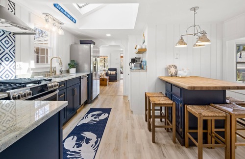 Escape to Oh Buoy Oh Buoy, our tastefully renovated Chatham cottage just one mile from the soft, white sand and warm waters of Hardings Beach. Nestled on a quiet cul-de-sac, this upscale vintage beach cottage is the perfect retreat for those seeking a refined experience. Light and bright with a coastal flair, the home has been completely remodeled and features fine furniture, new mini split AC units in bedrooms and living room, a private outdoor deck, stunning 3 season porch, living room with queen pull out couch, two king bedrooms with private ensuite baths and a glorious gourmet kitchen with island seating for six.