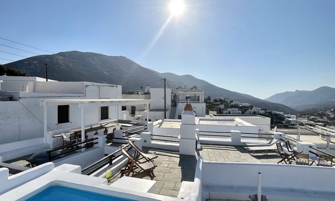 Fully renovated (2022) high standard, traditional villa in the heart of charming Apollonia. Perfectly located in the city centre, at walking distance from shops and restaurants, but in a quiet area. You can enjoy the magnificent view from the roof terrace, cool down in the dipping pool, or relax under the pergola which gives shade to the dining table.