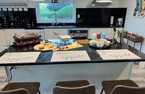 The villa offers an open floor concept combining living room, dining room and kitchen in the main floor with huge bay windows offering spectacular views. The living room has a wood-burning fireplace and a 55-inch smart TV with free Samsung TV channels, Netflix, Amazon prime, Disney Plus and YouTube Apps. Enjoy your morning coffee with our coffeemaker (coffee and milk powder included) or Nespresso machine with Aeroccino milk frother (capsules not included). The kitchen is fully equipped with all essentials: dishwasher, utensils, cookware, stove, refrigerator, microwave, oven toaster, oven with air fryer, fondue, raclette etc. A washer and dryer are also at your disposal. The master bedroom in the main floor has big windows with beautiful views, a king bed, workspace, walk in closet, ensuite bathroom with shower, towel heater and direct access to the Jacuzzi in the back patio. There is another spa-like bathroom on the main floor with claw-foot tub and forest views. Besides, there is a day bed in a lounging area with twin beds to sleep 2 adults. Lounge area with day bed, dining room and master bedroom have ceiling fans.