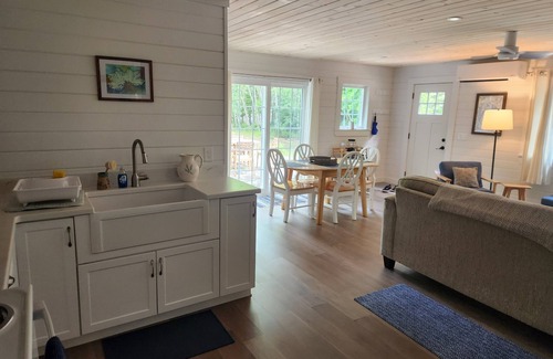 The cottage is newly renovated, with a fully equipped kitchen complete with coffeemaker and local coffee, an open living and dining area with lovely forest and water views, and comfortable brand new mattresses in the two bedrooms. Watch the sunset over the bay from your lovely bluestone patio or screened gazebo, or take a short walk through a wooded path to see stunning, expansive views of Burying Island on your own private point. At night, read a book, play a game, or watch a movie, then fall asleep to the breeze in the pines and aspens, and the calls of owls and loons!