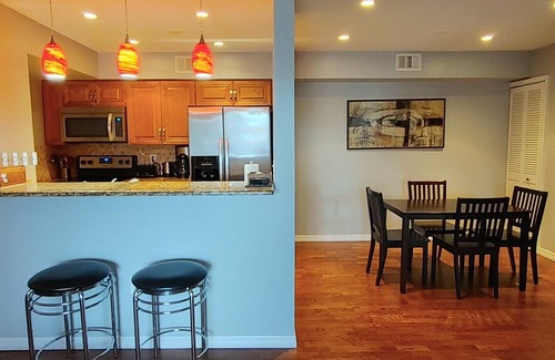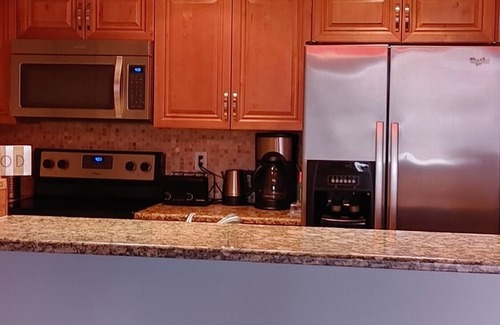 Kitchen with granite counter tops, hardwood throughout the condo, travertine marble in kitchen and bathroom, master bedroom with king-size bed, 2nd bedroom with a queen size bed, apartment will sleep a total of 5 people, pullout chair in the living room. Central A/C, Washer/Dryer...