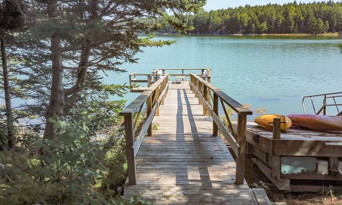 Welcome to this beautifully updated Mid-Century Ranch directly on Maple Juice Cove with over 200 feet of water frontage. Guests enjoy their own private 100-ft stationary wharf over the water (pictured) in addition to the 10X30 floating dock for direct access to the calm waters of Maple Juice Cove. Swim, kayak, innertube or just enjoy the views of nature as well as the comings and goings of the lobster fleet from Sheep’s Point. The property itself is 2 very private acres of lawn and gardens stretching along the waterfront, ideal for yard games, or just enjoying the ever changing water views.